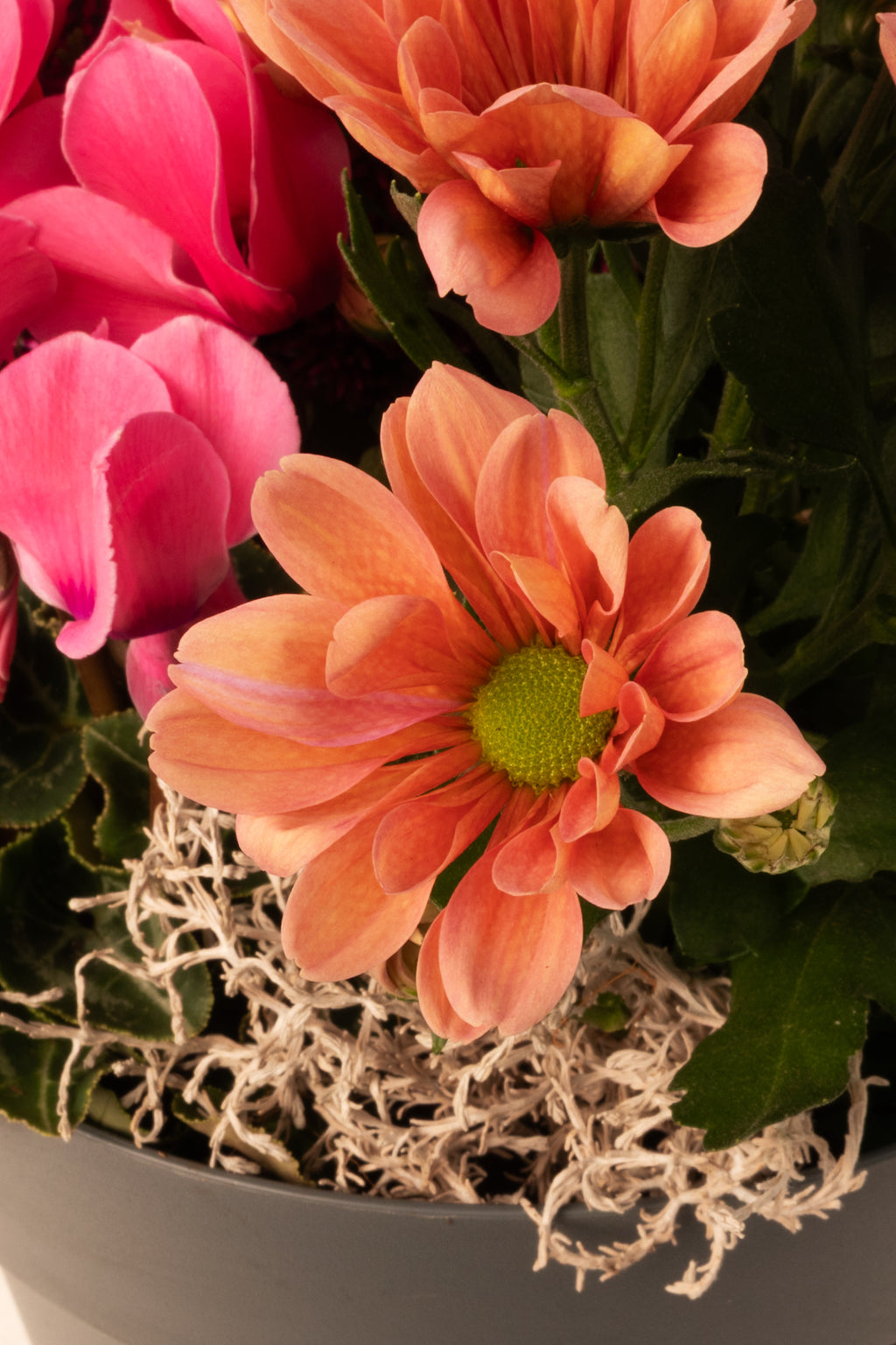 Autumn Bloom es una composición floral que reúne lo mejor de la temporada: ciclámenes de tonos intensos, crisantemos alegres, callunas en plena floración y otras variedades otoñales que se combinan en un equilibrio perfecto de color y textura. Una pieza que ilumina cualquier espacio con la energía vibrante de las flores de otoño.