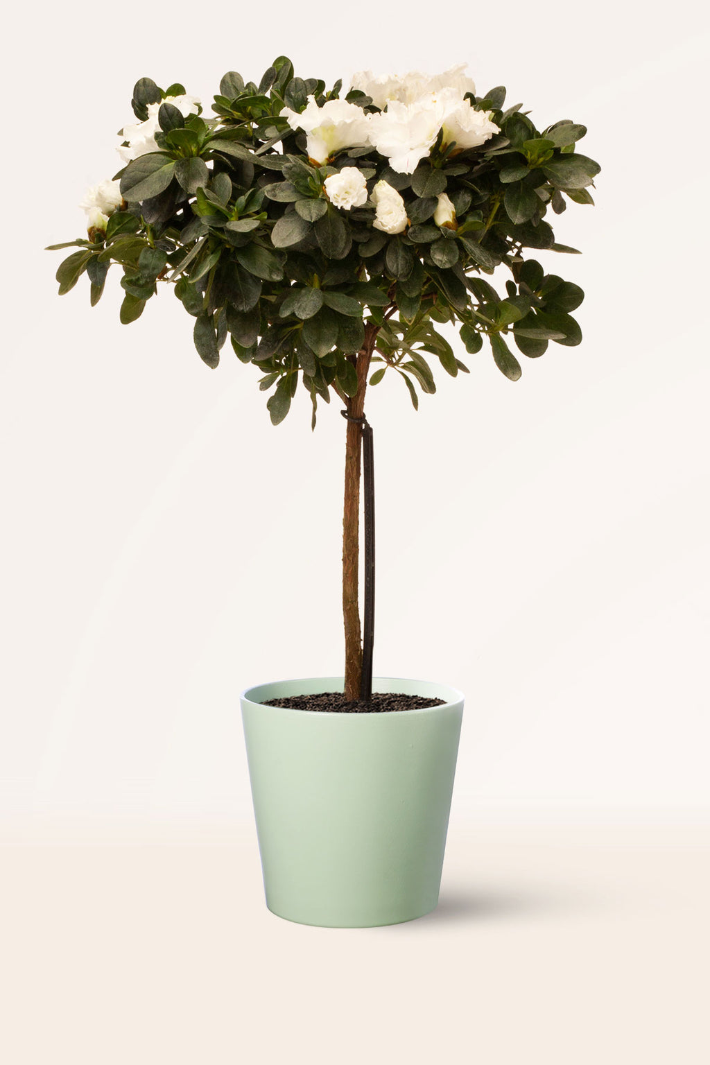 Esta preciosa planta ornamental es conocida como Azalea pero su nombre científico es en realidad Rhododendron indicum o simsii. La Azalea blanca en copa es una planta de exterior habitual en jardines, terrazas y balcones. Suele crecer en forma de arbusto y tiene floración abundante siempre que se sigan sus cuidados diariamente.