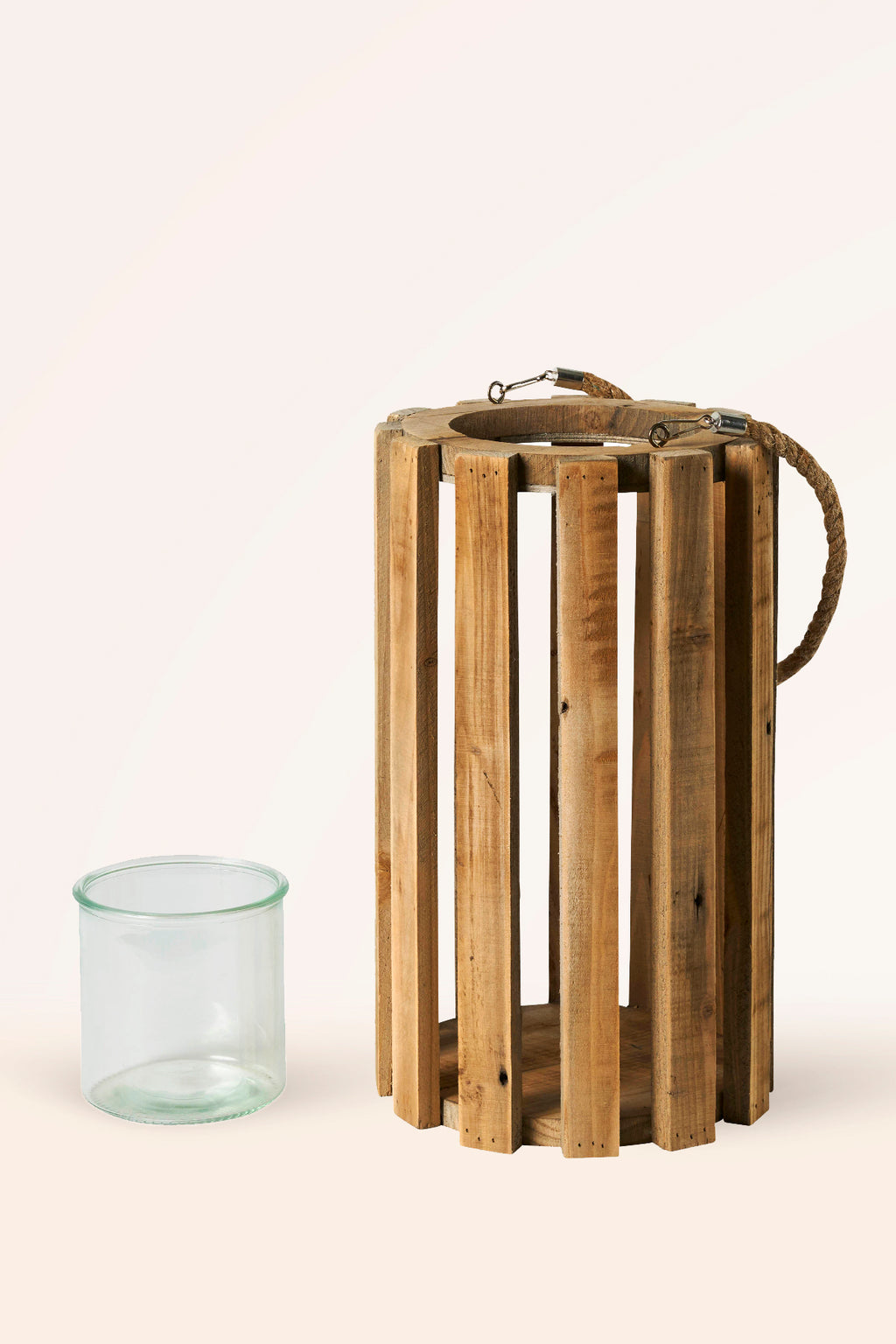Un farol de madera con listones verticales y acabado natural que deja pasar la luz con un efecto cálido y sereno. Su estructura tipo jaula y el asa de cuerda lo convierten en una pieza fácil de mover y perfecta para aportar textura y calma en el salón, el recibidor o la terraza, con un aire rústico–elegante muy editorial.
