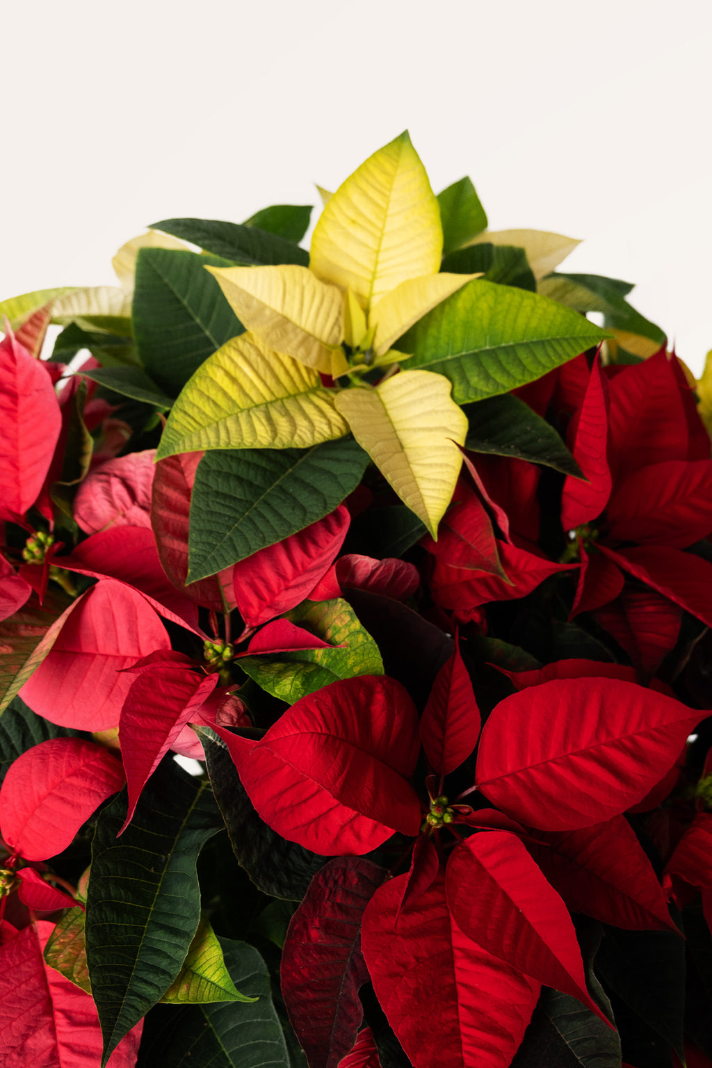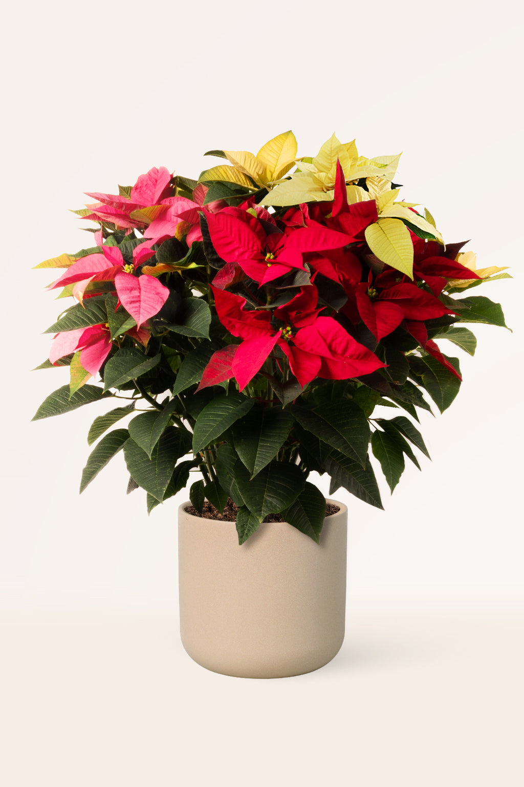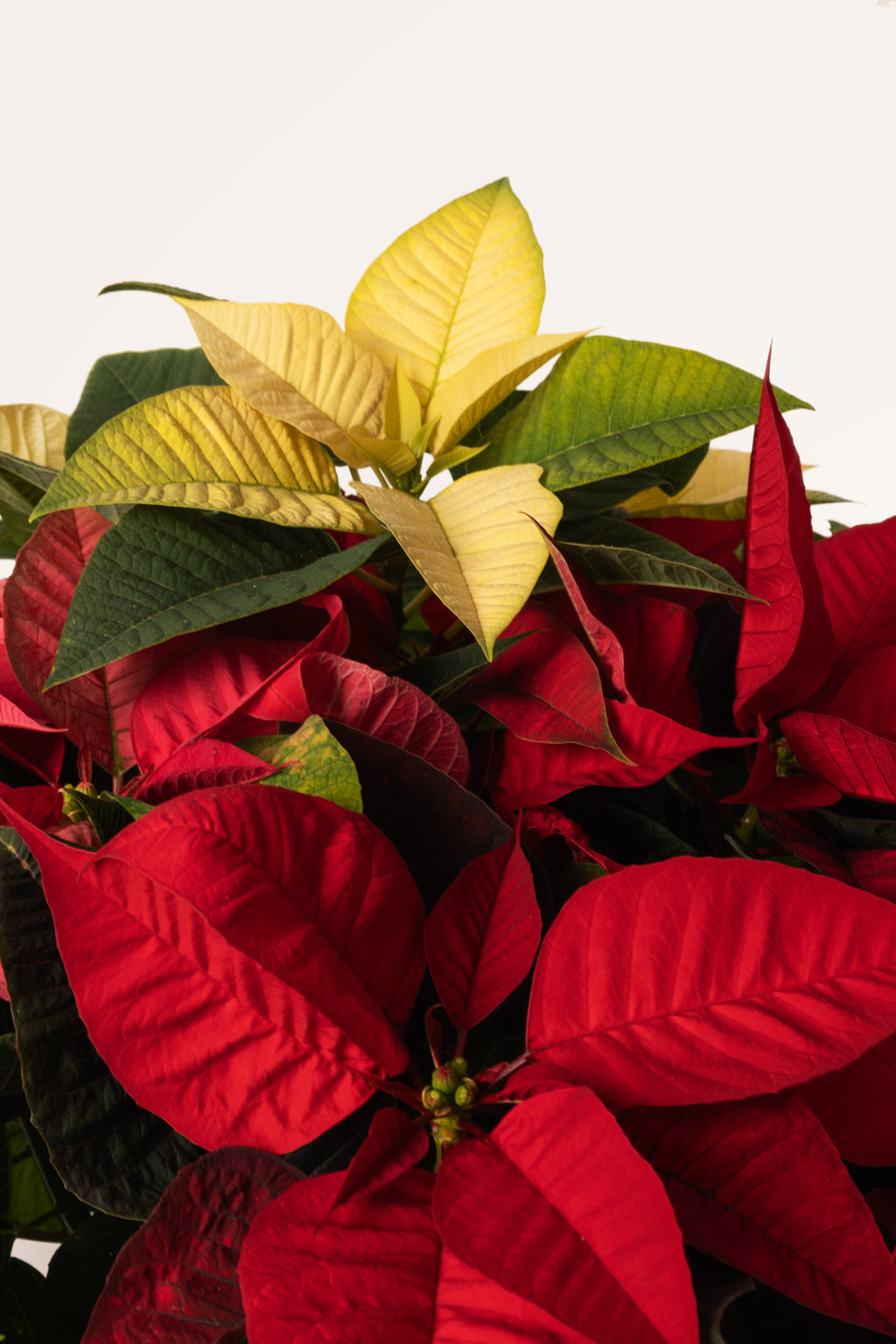 La Poinsettia (Euphorbia pulcherrima), también conocida como Flor de Pascua, es la planta más emblemática de la Navidad. Su belleza radica en sus brácteas de colores intensos, generalmente rojas, aunque también las hay en tonos rosados, blancos o crema, que enmarcan pequeñas flores amarillas en el centro. Originaria de México, esta planta tropical aporta color, vida y calidez a los hogares durante los meses de invierno.
