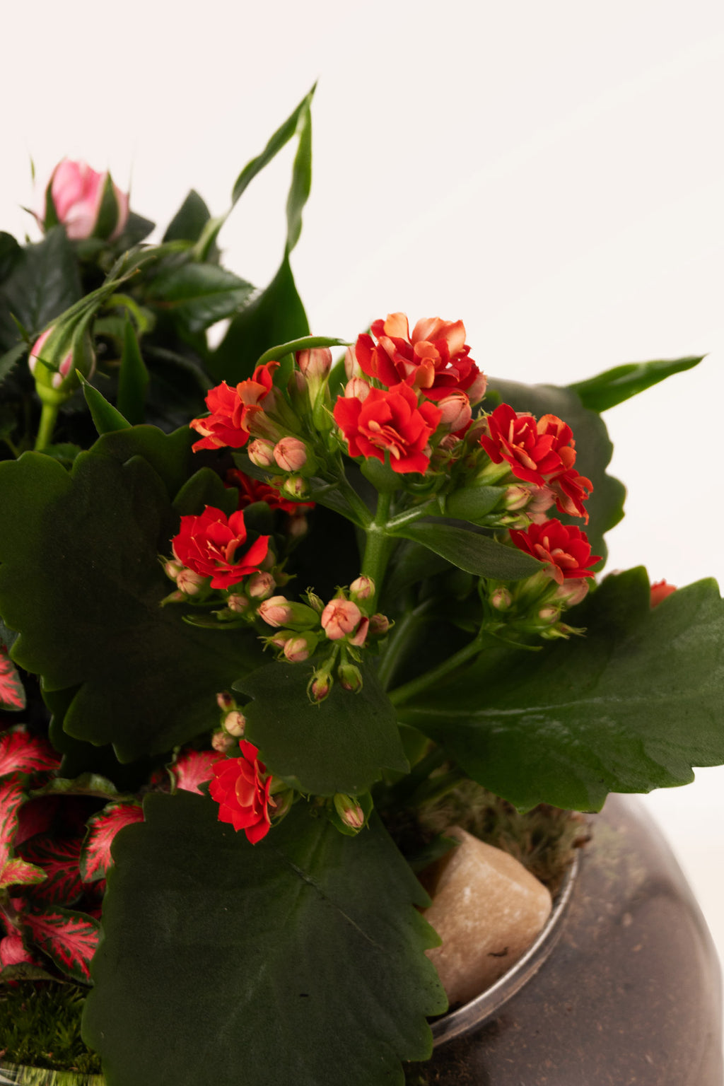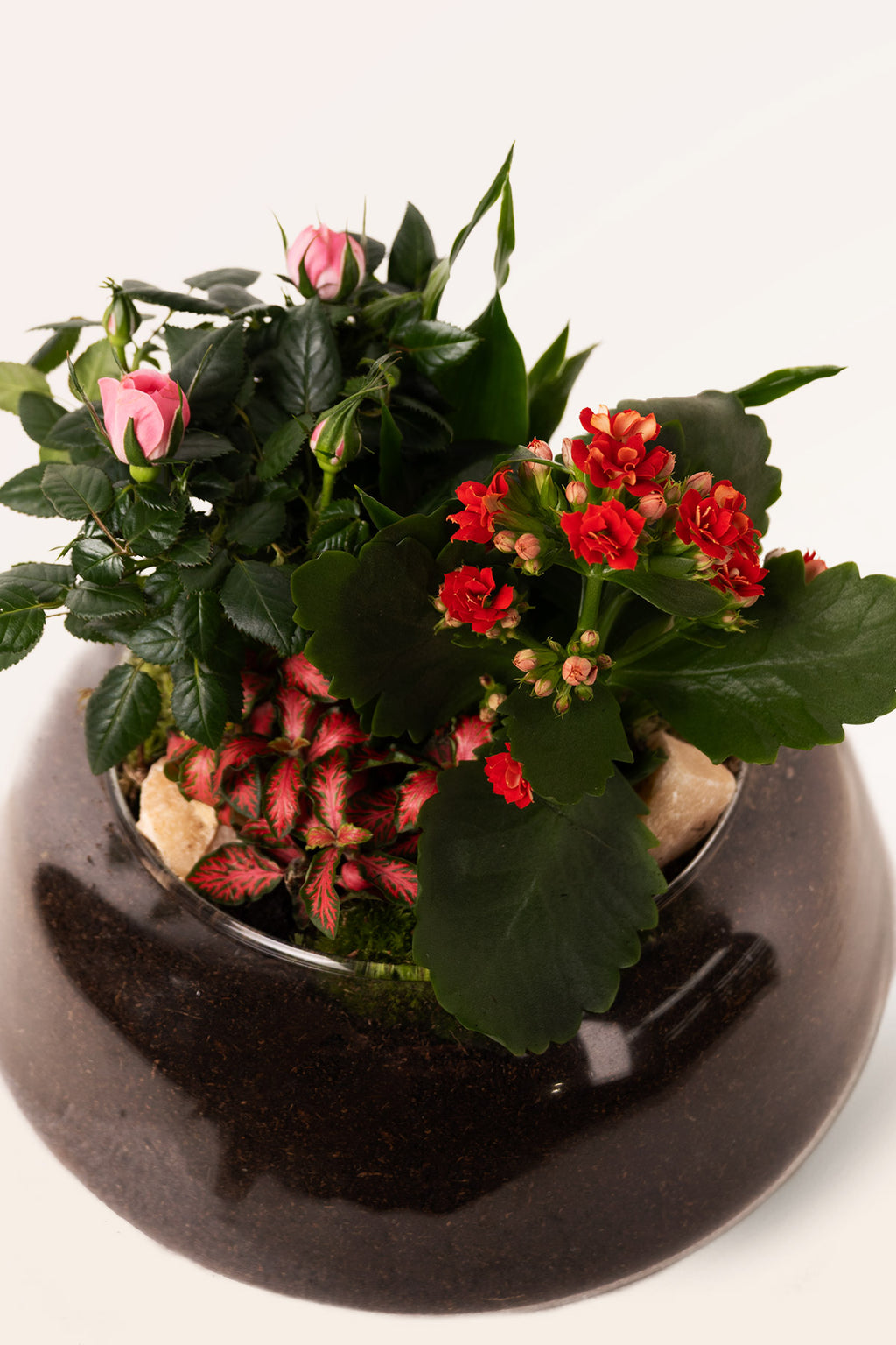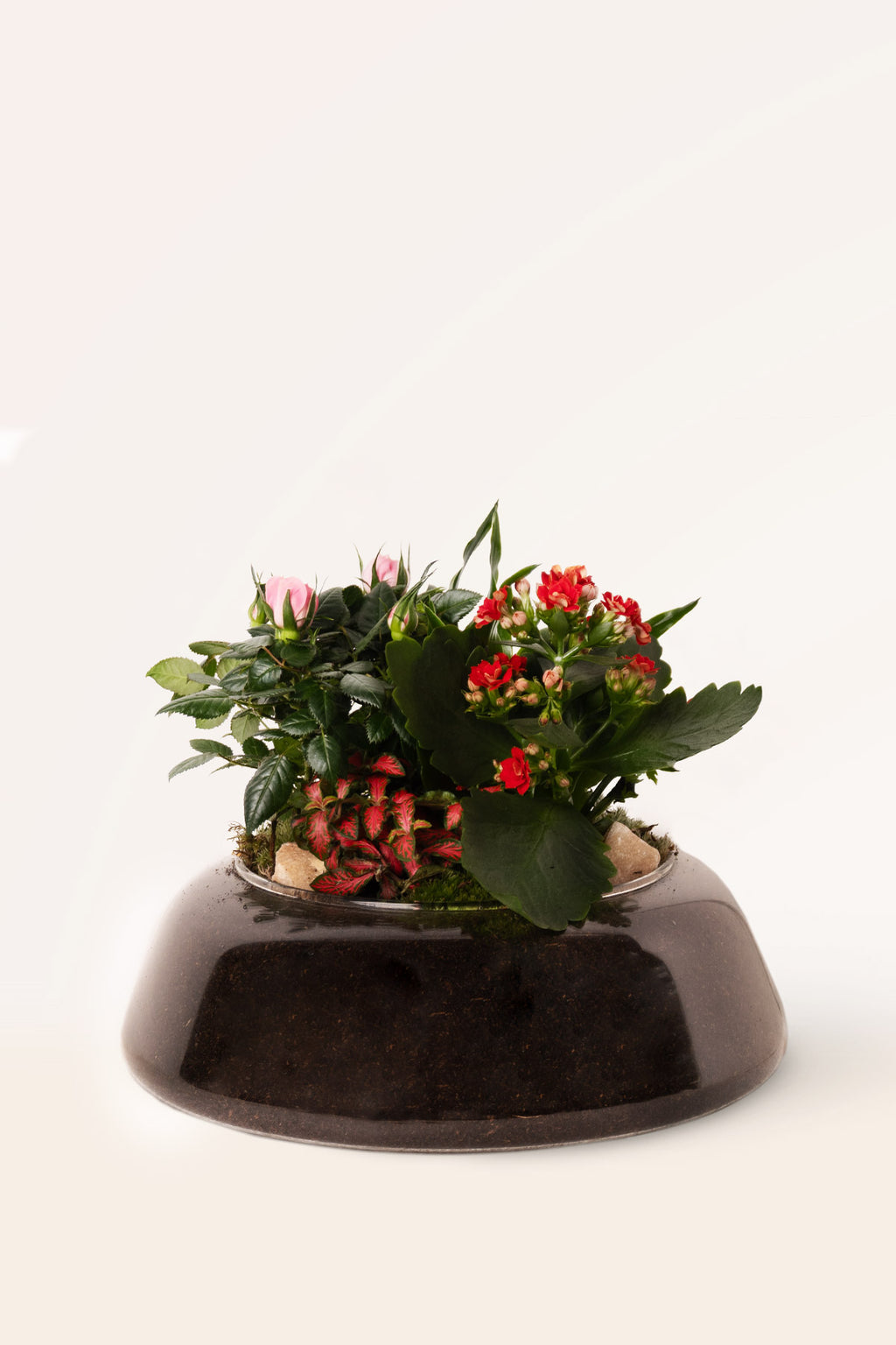 El Flora Mix Garden es una composición floral de aire romántico que combina distintas plantas de flor y follajes decorativos en un pequeño paisaje lleno de matices. Los capullos rosados y las floraciones rojas conviven con hojas intensas y texturas vegetales que aportan profundidad, creando una escena viva que cambia con los días. La base se completa con musgo natural, piedras y tierra de alta calidad, y se presenta en un elegante recipiente de cristal que realza la composición como una pieza de interior.