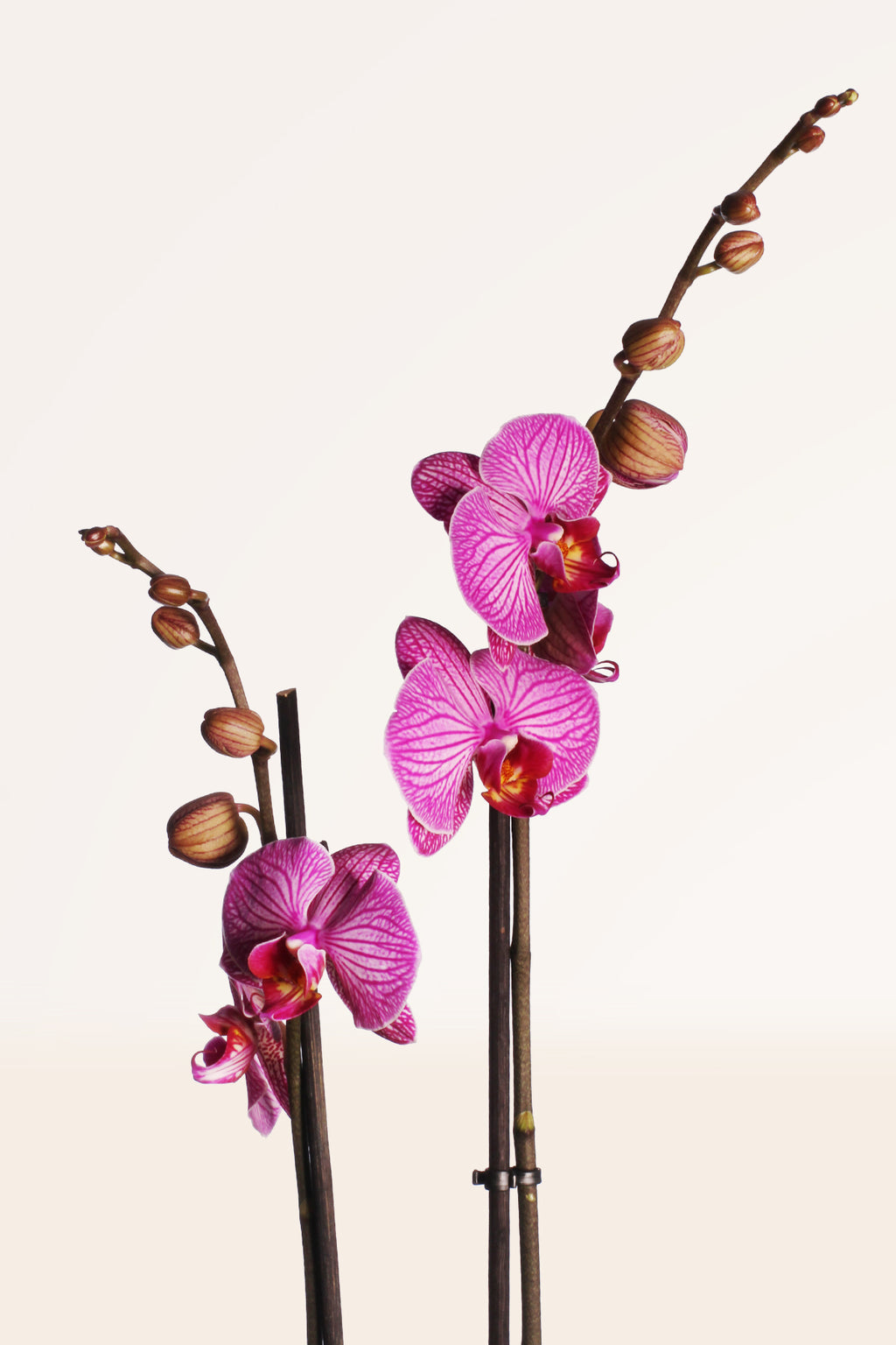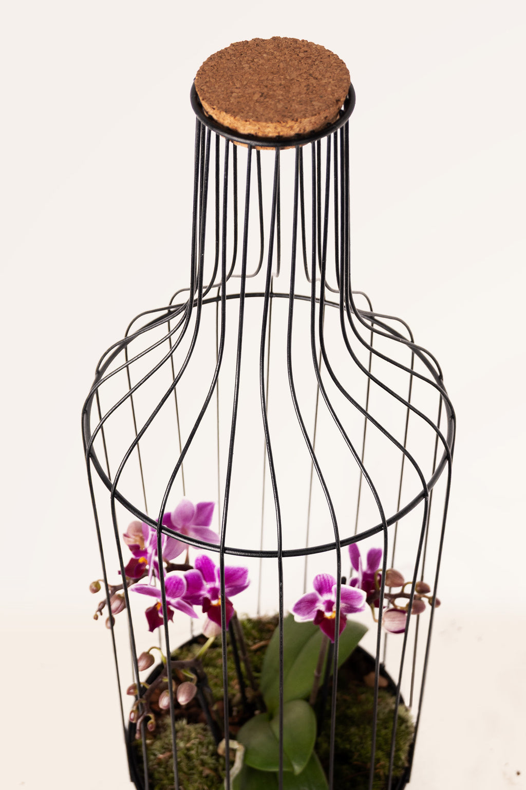 Un pequeño jardín que parece suspendido en el aire. Orquídea bajo una estructura de metal con silueta de botella y remate de corcho, donde las líneas negras dibujan una vitrina ligera alrededor de la flor.