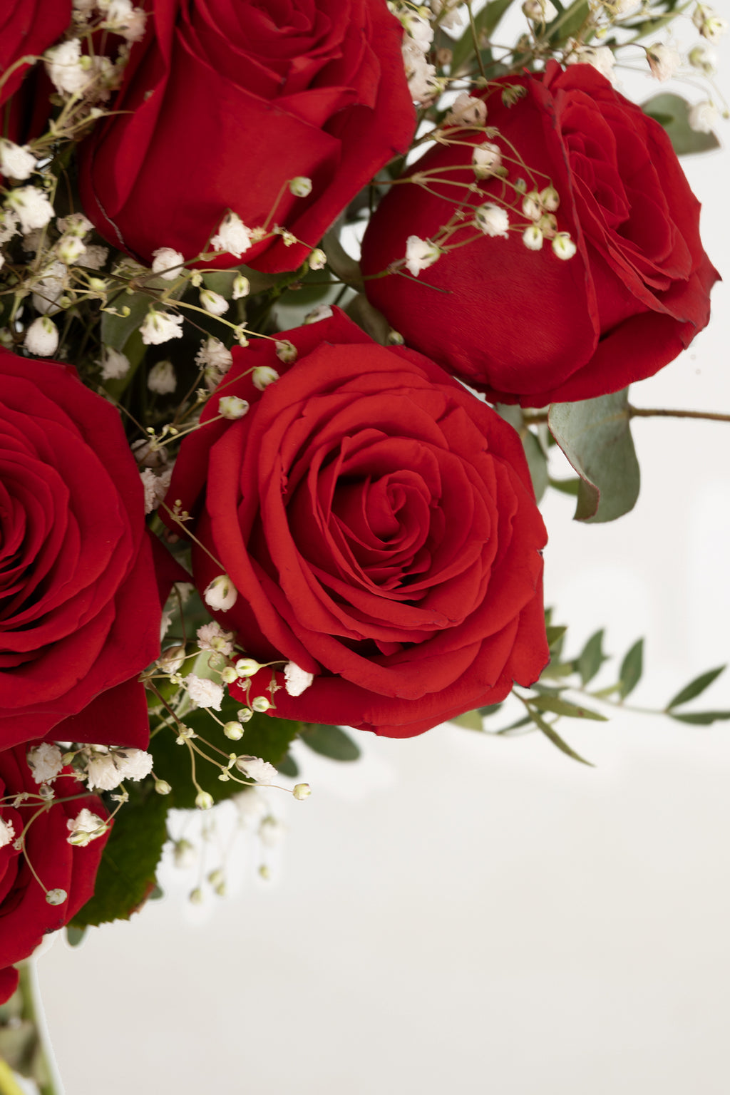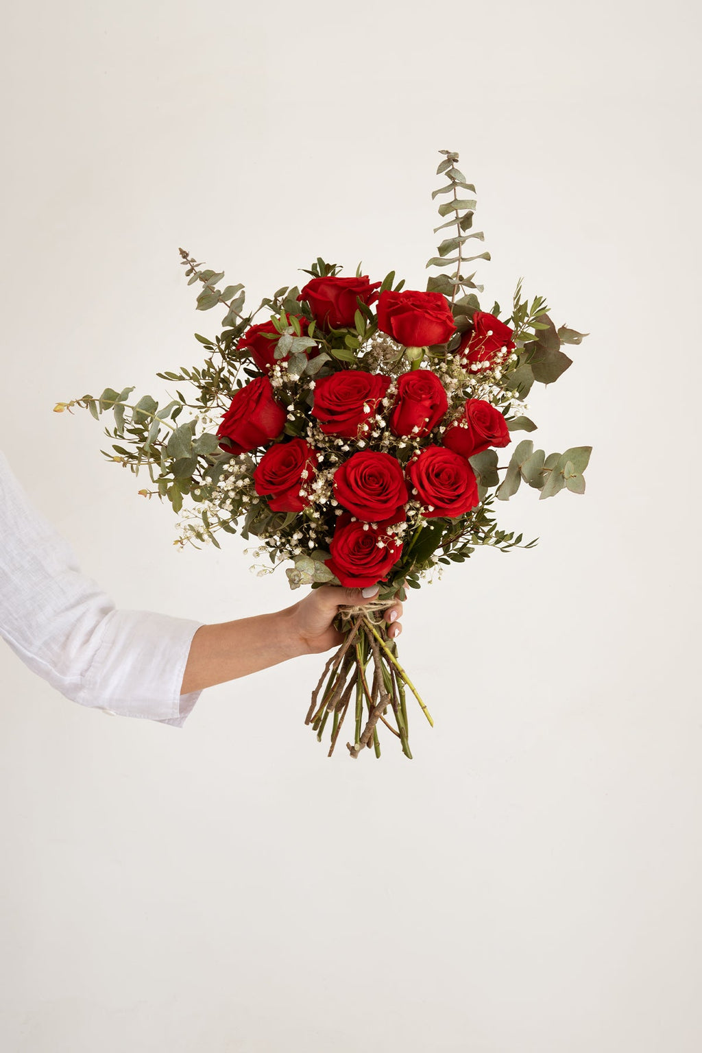 Este ramo de rosas ha sido creado con todo el cariño por nuestros expertos floristas e incluye: 12 Rosas rojas, Eucalipto, Paniculata y Lentisco.