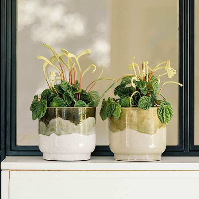 Maceta de cerámica en color verde con esmalte en tonos ocre, perfecta para aportar calidez y un toque artesanal a cualquier planta de interior. Es un cubremacetas pensado para uso en interior, ya que no incluye agujero de drenaje.